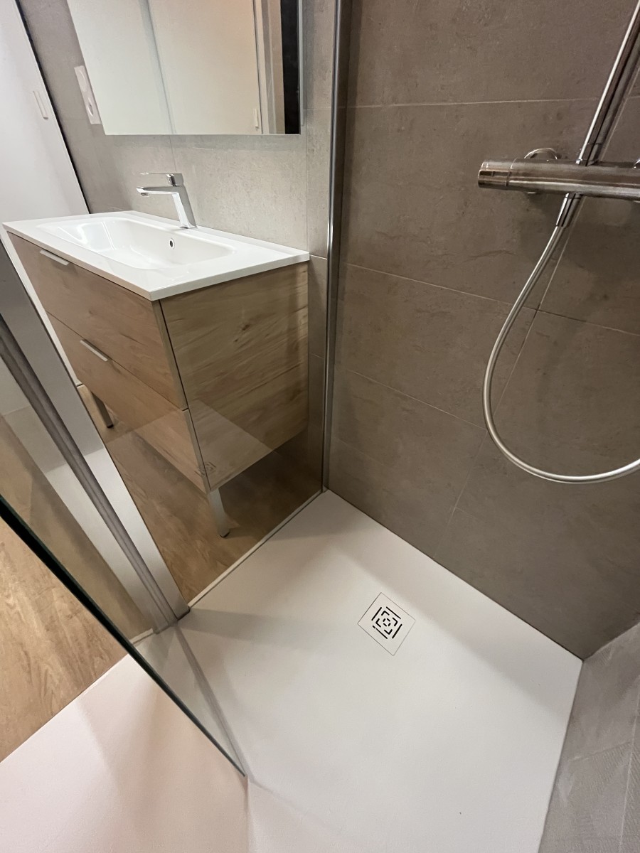 • Rangement & Ergonomie : Le lavabo sur colonne a laissé place à un meuble vasque moderne, complété par une colonne de rangement assortie pour une organisation optimale.